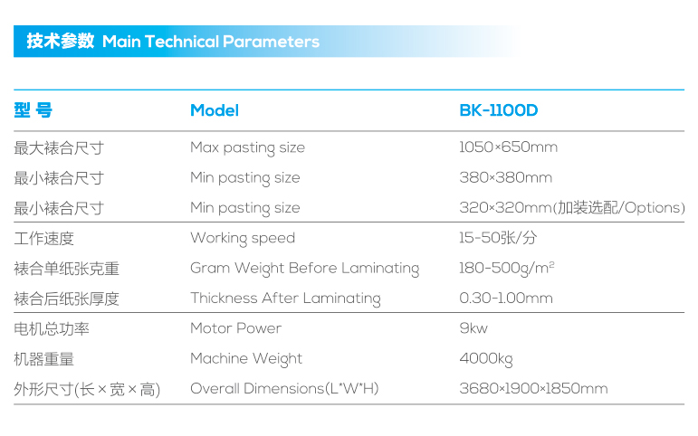 BK-1100D Semi-automatic Cardboard Laminating Machine,the face side is Feida paper feeding,and the bottom side is artificial paper feeding。the paper feeding roller of the face paper side is driven by separate servo,which can meet the requirements of separating and overlapping continuous paper feeding within the paper feeding range。the bottom paper and the face paper are equipped with Front guide and double side guide to locate,and the mounting accuracy can reach 0.5mm.the whole machine is small and fine,electrical configuration for SIEMENS, AirTAC, WEINVIEW and other well-known brands,skilled users a person can control,use and maintenance are very convenient,suitable for producing all kinds of packing cartons。skilled one person can operate, saving a lot of labor cost compared with manual model.