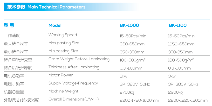 BK-1000/1100 Semi-automatic cardboard Laminating machine adopts imported frequency converter to step-less change the speed, equips with the photo electricity counts and digital display, uses a little of the glue dosage to reduce the production cost.Suitable for producing all kinds of packing cartons。
